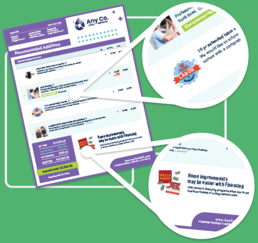 Add power to your quotes with in-quote marketing messages pitching benefits such as financing and pay-over-time options, service contracts and warranties, energy savings and rebate information, and much more.
