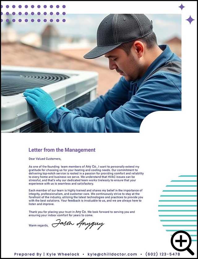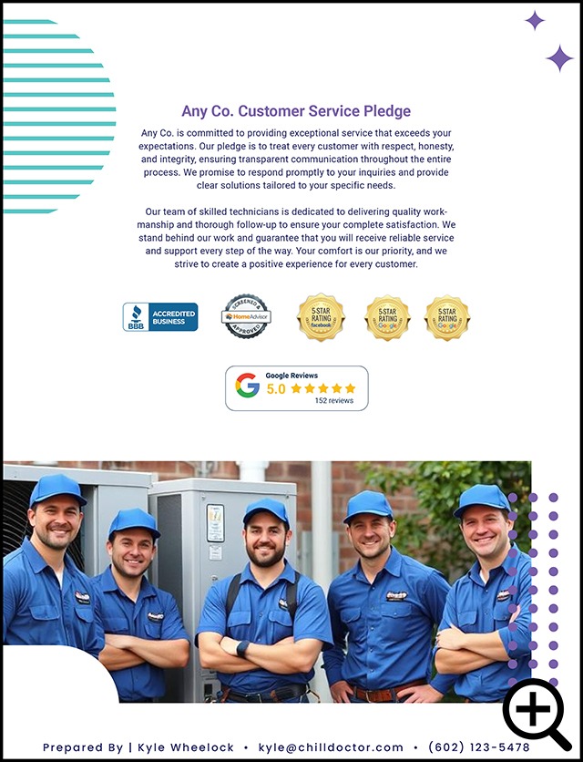 Start with a custom designed set of master quote templates including pages with reviews and testimonials, customer services pledge, letter from the leadership, about your company, and much more.