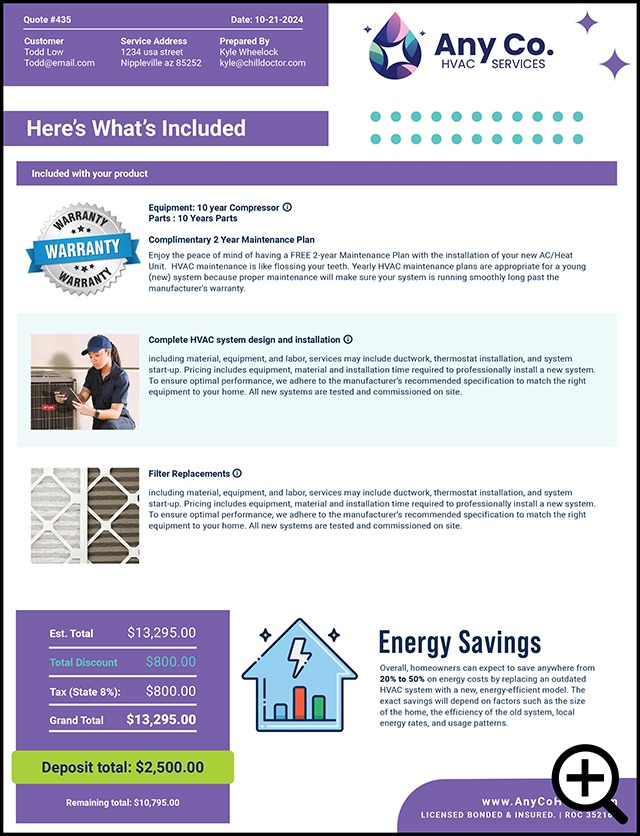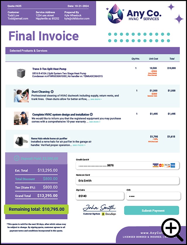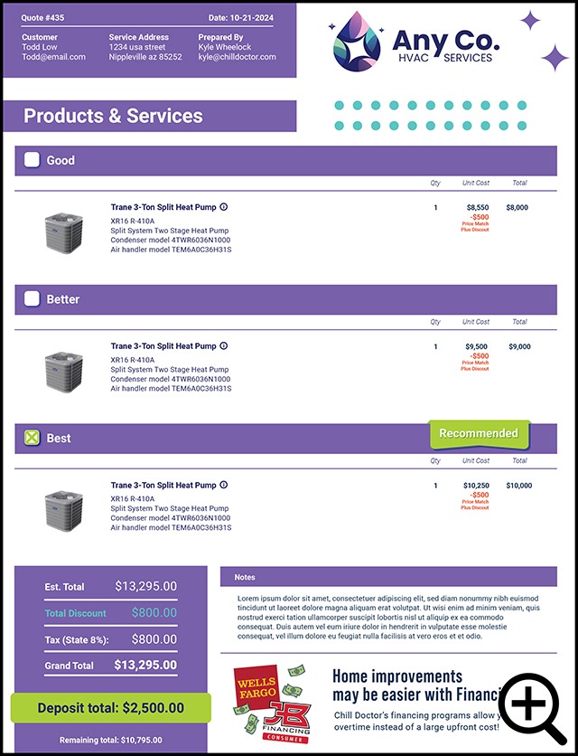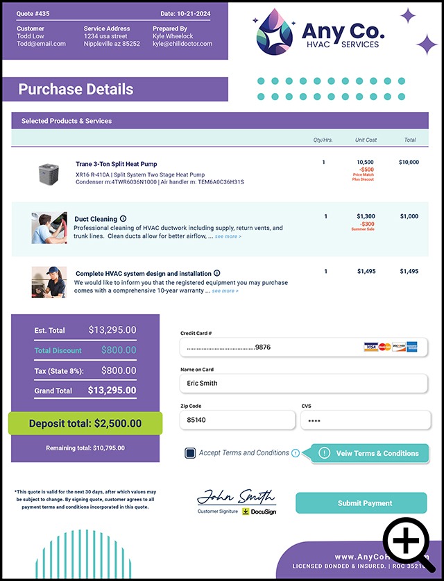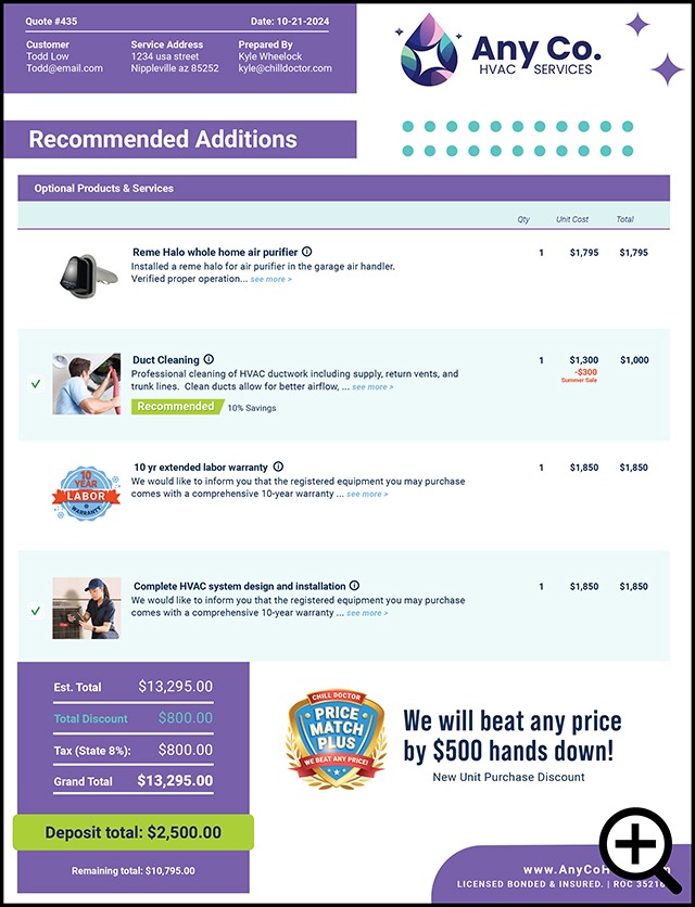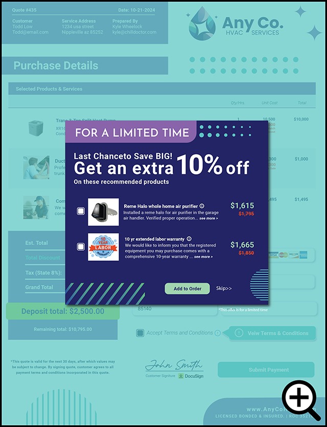 Our custom quote templates work hand in hand with our powerful, proprietary quoting software and branded customer portal to offer dynamic abilities that no other quoting system can match including automatic upselling, urgency timer, in-quote payments, automated email and text reminders and more.